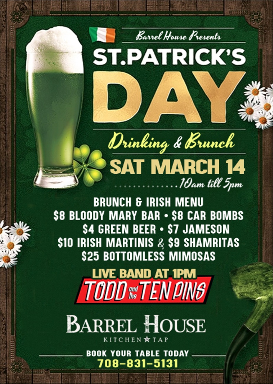 $8 BLOODY MARY BAR | $8 CAR BOMBS | $4 GREEN BEER | $7 JAMESON $10 IRISH MARTINIS & $9 SHAMRITAS | $25 BOTTOMLESS MIMOSAS