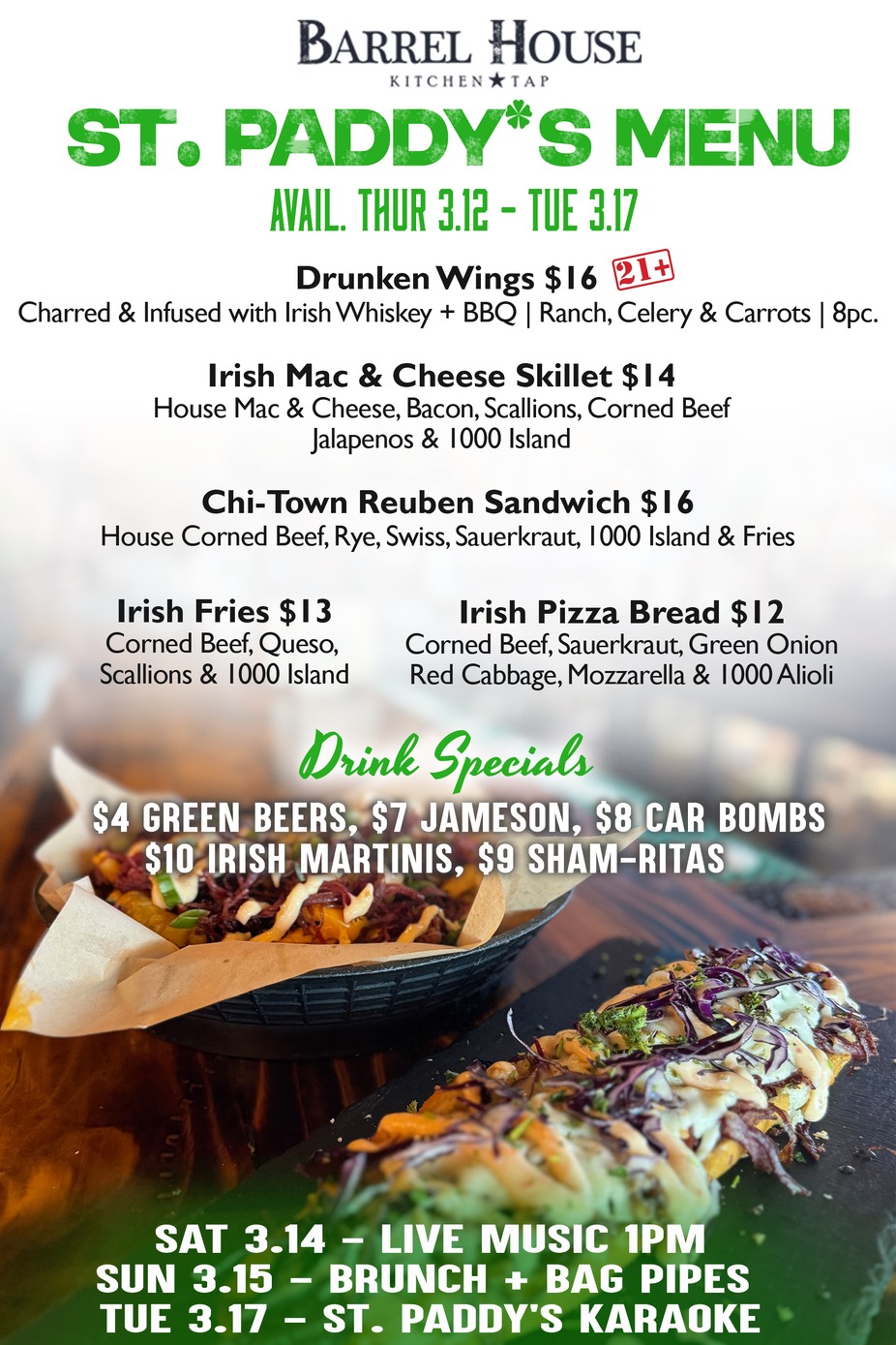 Drink Specials: $4 Green Beer | $7 Jameson | $8 Car Bomb | $10 Irish Martini | $9 Sham-Ritas